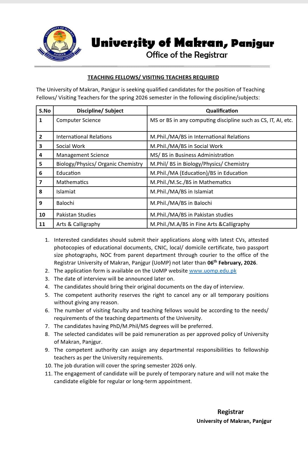 Teaching Fellows/ Visiting Teachers Required